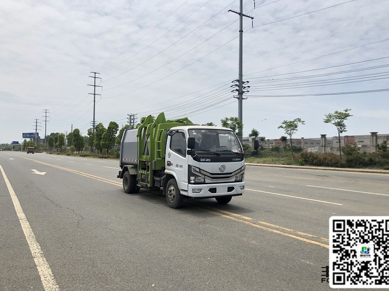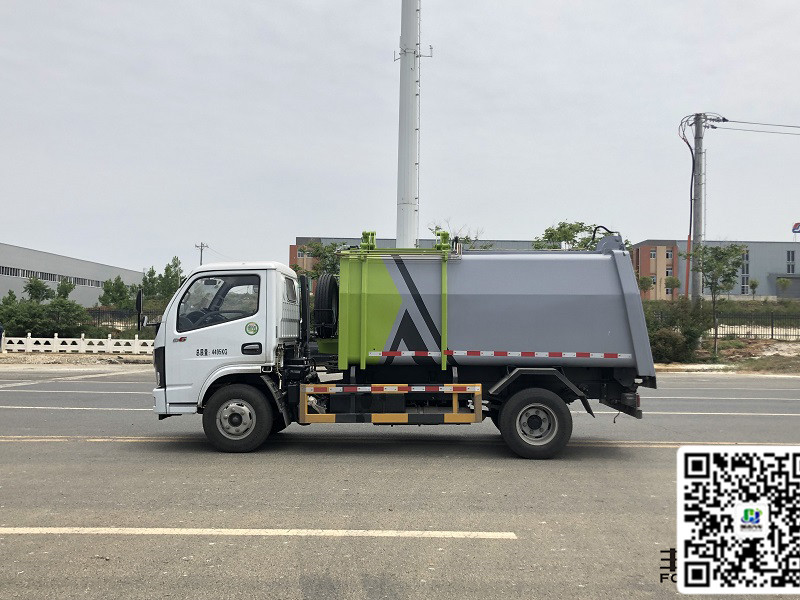 采用全金属矩形结构的密封式垃圾箱,在垃圾箱的上部设有进料箱盖,使整车美观大方,而且防止垃圾的倾洒。侧面装有自装料设置,极大的减轻了操作人员的工作量。在垃圾箱尾部装有液压举升装置,使操作人员卸垃圾时不用出驾驶室就可以打开后门。